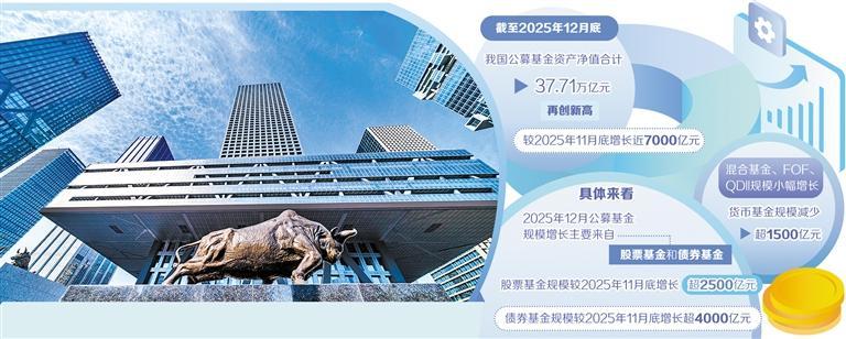 在盈利能力持续释放的同时,公募基金行业的资产管理规模亦稳步攀升。截至2025年12月底,我国公募基金总规模达37.71万亿元,再创历史新高。这一数据反映出公募基金市场扩容趋势依然延续,同时也印证了投资者对公募产品长期配置价值的认可度。