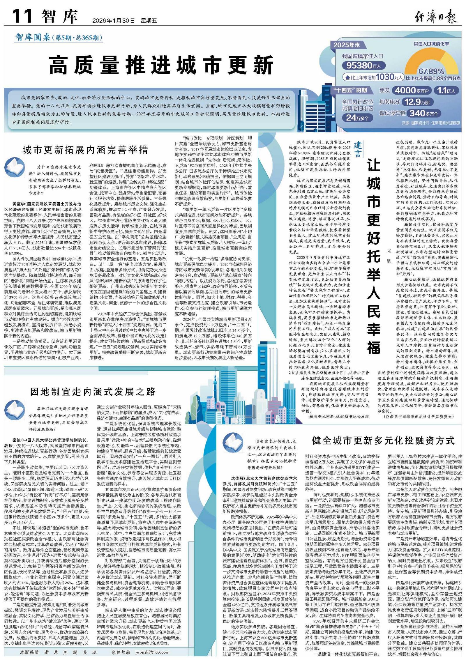 2025年7月召开的中央城市工作会议指出当前和今后一个时期城市工作的总体要求,强调“转变城市发展理念,更加注重以人为本”“转变城市发展方式,更加注重集约高效”“转变城市发展动力,更加注重特色发展”“转变城市工作重心,更加注重治理投入”“转变城市工作方法,更加注重统筹协调”。城市更新一头连着民生福祉,一头连着城市发展,是城市工作的重要抓手。实践表明,高质量推进城市更新绝非简单的“拆旧建新”,而是一项复杂的系统工程。比如,“以人为本”不能停留在概念上,需因人施策、精准适配,重点解决四个“2亿”人群的问题:2亿多儿童对于安全、健康生活环境有新需求;2亿多老年人的住房适老化设施不足,不适应居家养老需求;2亿多新市民、青年人中约70%租房居住,住房困难突出;2亿多居民生活在城镇老旧小区中,这些小区普遍存在建筑老化、设施不健全等问题。