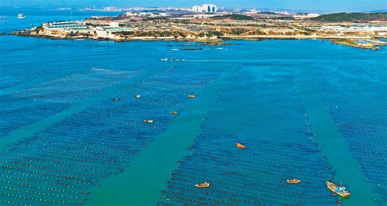1月8日,山东省荣成市爱伦湾海洋牧场,渔民驾驶养殖船在海带养殖区进行冬管作业。
