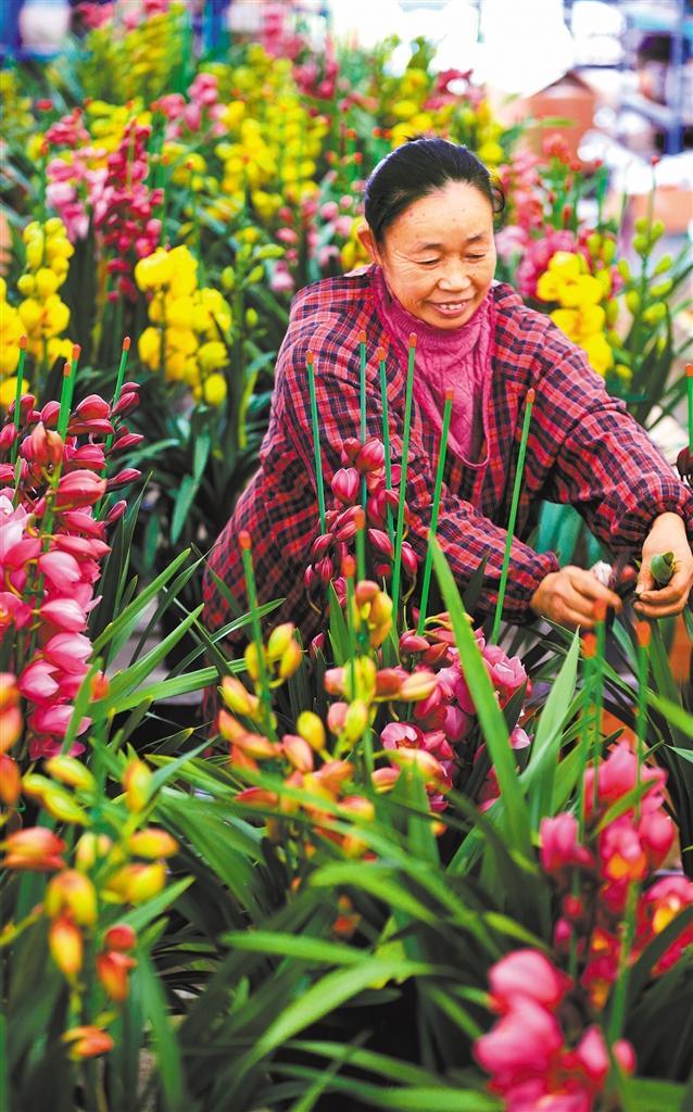 2025年12月26日,四川省乐山市牟子镇花卉种植基地大棚,花农在管护蕙兰花。