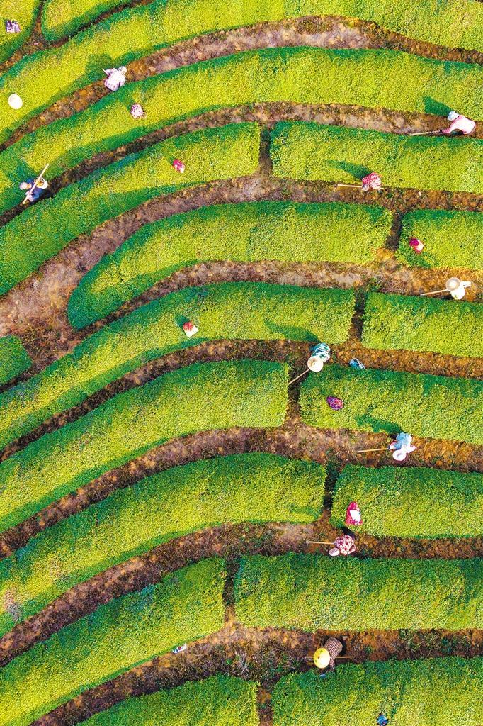 2025年12月20日,江西省上饶市婺源县紫阳镇考水有机茶园,茶农对茶树进行修枝、除草、施肥。