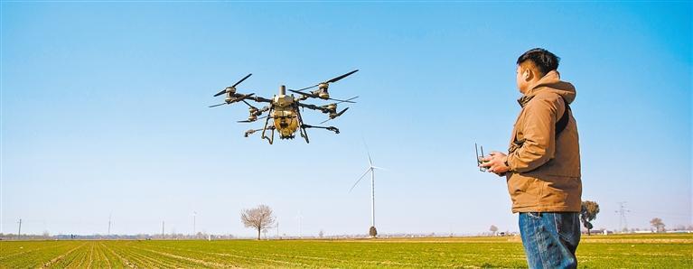 1月13日,河南省商丘市睢县皇台村高标准农田,农技人员操控植保无人机对冬小麦进行高效施肥与除草作业。