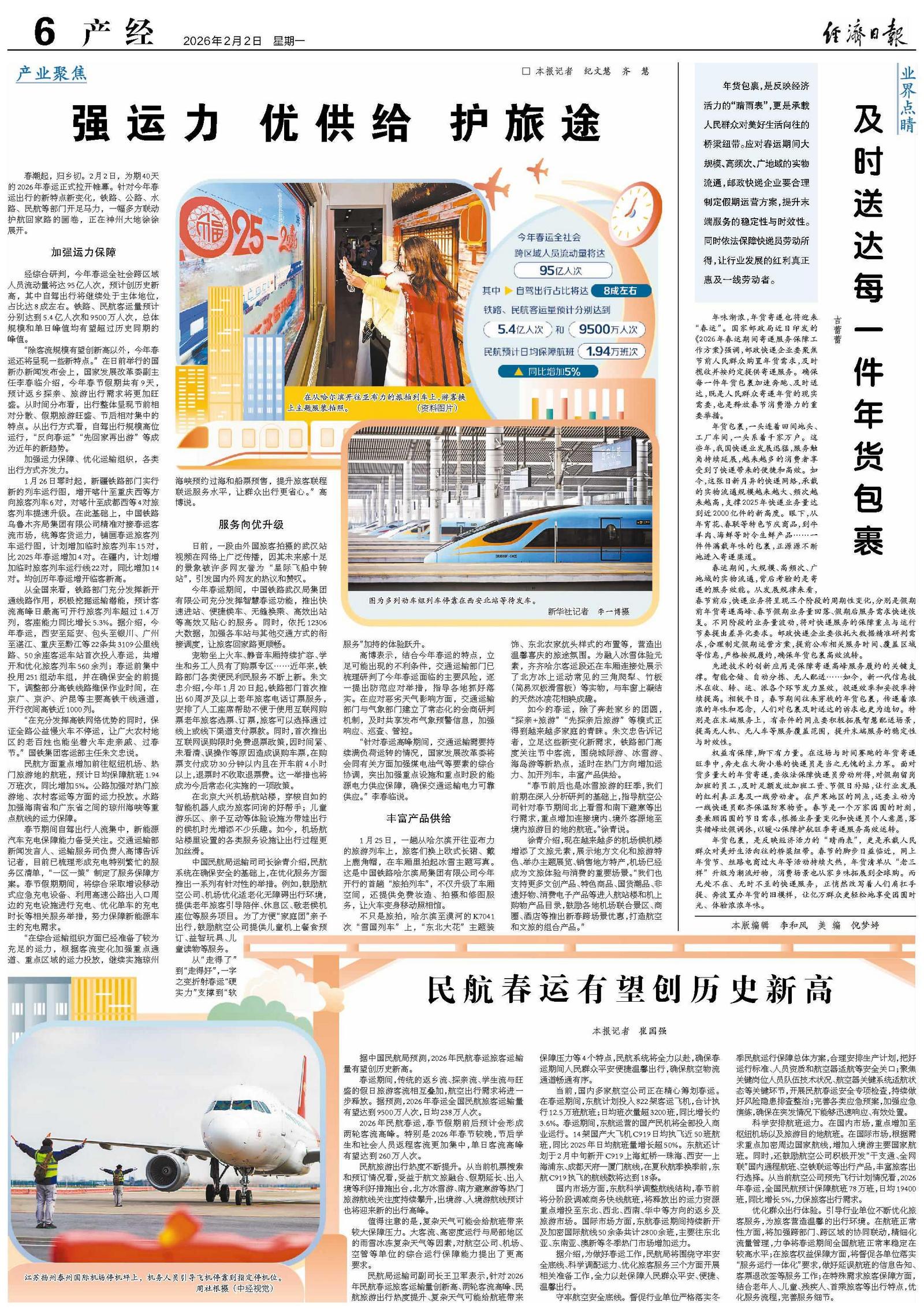 春潮起,归乡切。2月2日,为期40天的2026年春运正式拉开帷幕。针对今年春运出行的新特点新变化,铁路、公路、水路、民航等部门开足马力,一幅多方联动护航回家路的画卷,正在神州大地徐徐展开。