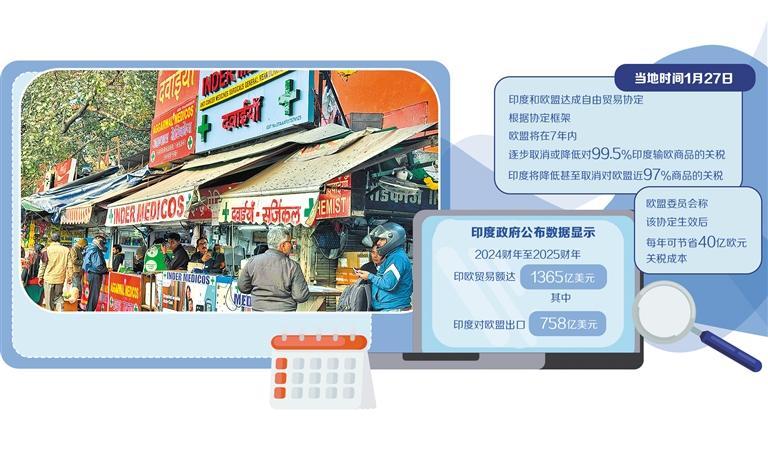 当地时间1月27日,印度与欧盟领导人在印度首都新德里举行会晤。印度总理莫迪宣布,印度和欧盟达成自由贸易协定,并表示该协定覆盖全球国内生产总值(GDP)的25%和全球贸易额的三分之一。根据印度政府公布的数据,2024财年至2025财年,印欧贸易额达到1365亿美元,其中,印度对欧盟出口758亿美元。该自贸协定达成后,预计未来5年,双边贸易额或将翻番。