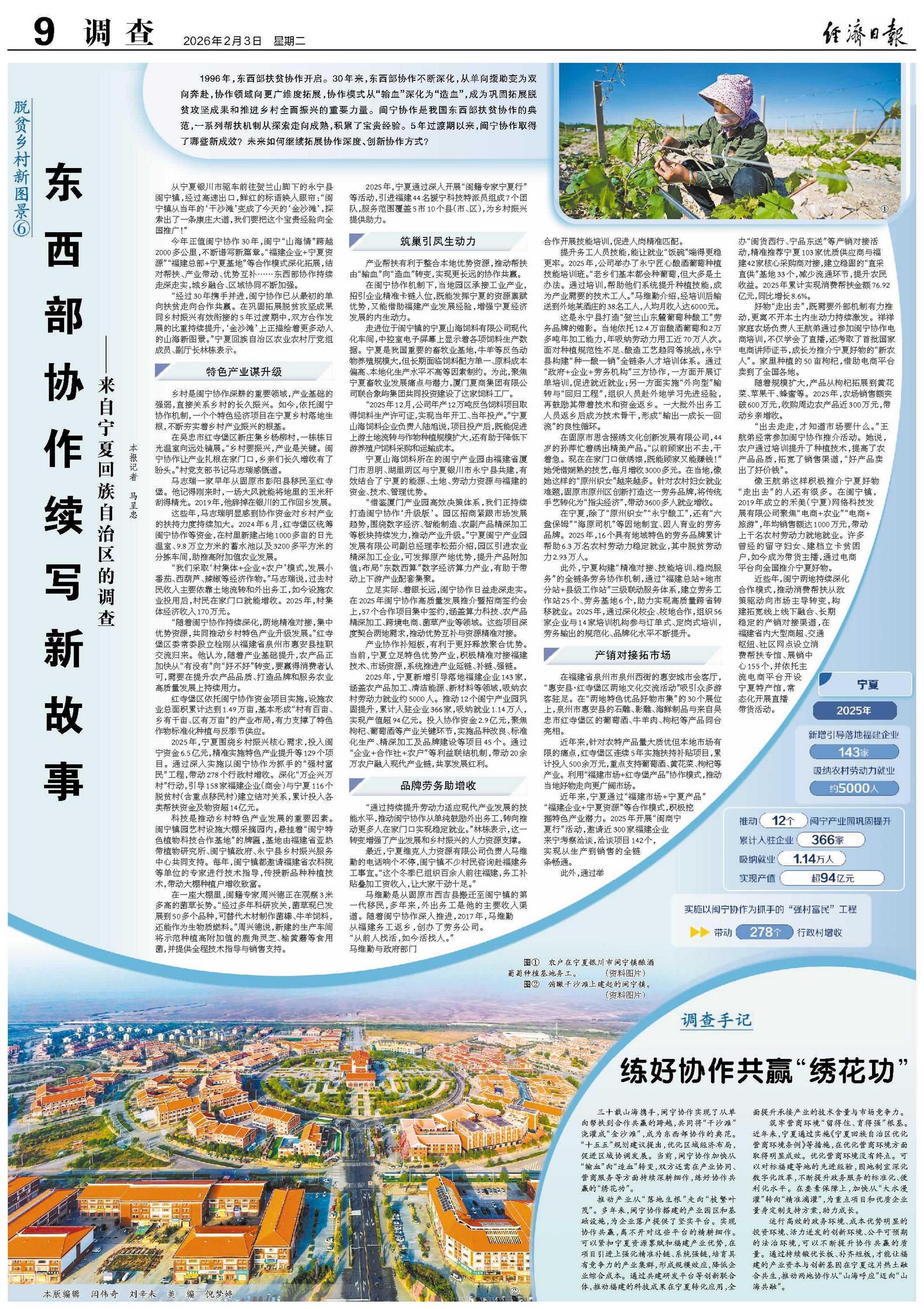 今年正值闽宁协作30年,闽宁“山海情”跨越2000多公里,不断谱写新篇章。“福建企业+宁夏资源”“福建总部+宁夏基地”等合作模式深化拓展,结对帮扶、产业带动、优势互补……东西部协作持续走深走实,城乡融合、区域协同不断加强。