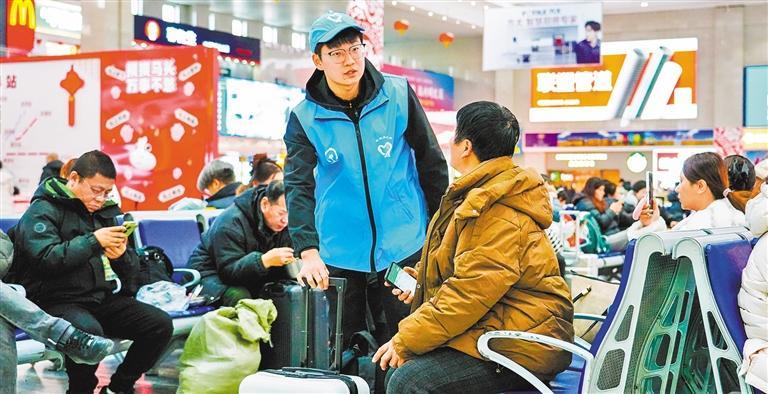 2月2日,铁路长春站候车室,大学生志愿者在解答旅客问询。该站招募140名大学生志愿者,在关键岗位为旅客提供引导、帮扶服务。潘 乐摄(中经视觉)