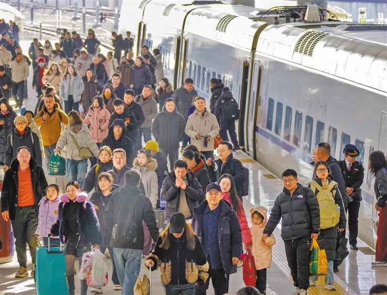 2月2日,太原南站出行旅客正有序进站乘车。2026年春运期间,中国铁路太原局集团有限公司预计发送旅客980万人次,每日办理旅客列车290对。孙 浩摄(中经视觉)