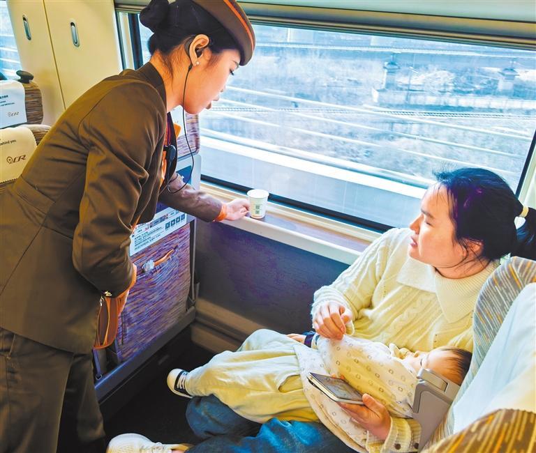 2月2日,G341列车上,中国铁路武汉局集团有限公司武汉客运段列车员屈露为单独带儿童出行的旅客提供帮助。春运期间,武汉局为携带儿童出行的家庭推出了多项贴心服务,让“童行”更安全、更温馨。胡松丹摄(中经视觉)