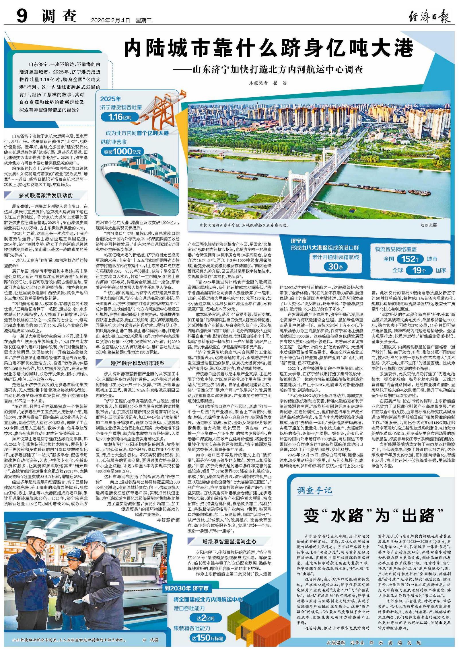 山东济宁,一座不沿边、不靠海的内陆资源型城市。2025年,济宁港完成货物吞吐量1.16亿吨,跻身全国“亿吨大港”行列。这一内陆城市跨越式发展的背后,经历了怎样的故事,其对自身资源和优势的重新定位及探索有哪些值得借鉴的经验?