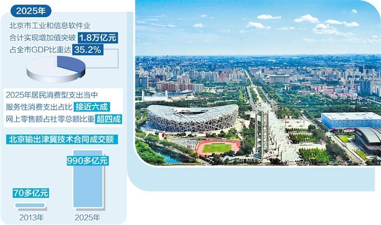 “2025年,北京市高精尖产业发展稳中有进,工业和信息软件业合计实现增加值突破1.8万亿元,占全市GDP比重达到35.2%,对全市经济增长的贡献率达六成左右。”北京市经济和信息化局党组成员、副局长刘维亮说。