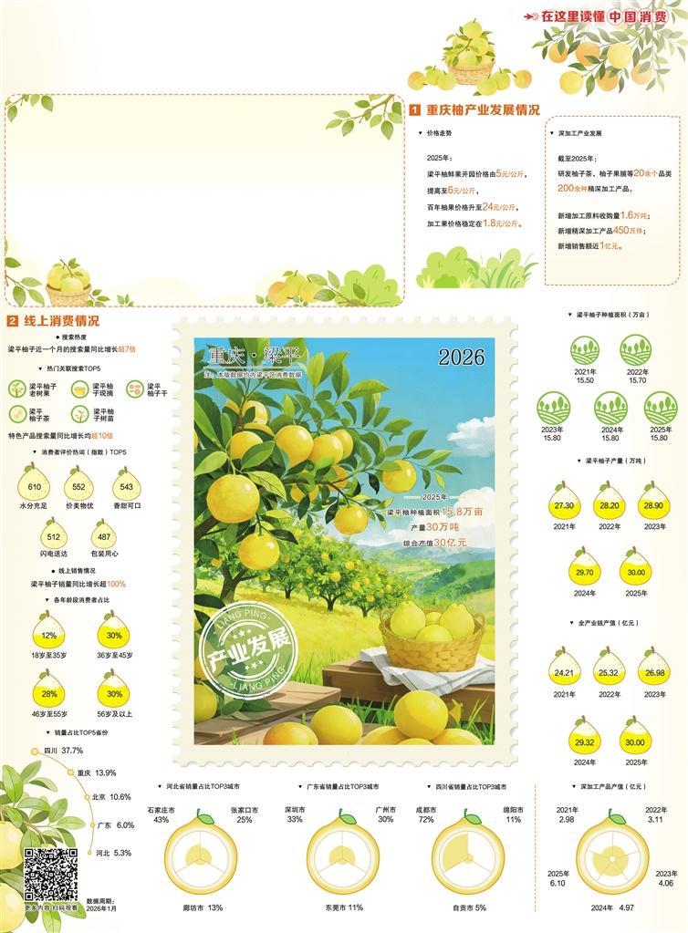 重庆梁平柚,与广西沙田柚、福建文旦柚并称为“中国三大名柚”,是全国农产品地理标志产品。近年来,重庆市梁平区加强品种培优、品质提升、品牌打造,促进一二三产业深度融合,“小柚子”发展成了“大产业”。2025年,梁平柚种植面积15.8万亩、产量30万吨,综合产值30亿元,通过全产业链构建与品牌化运营,焕发出前所未有的产业生机。