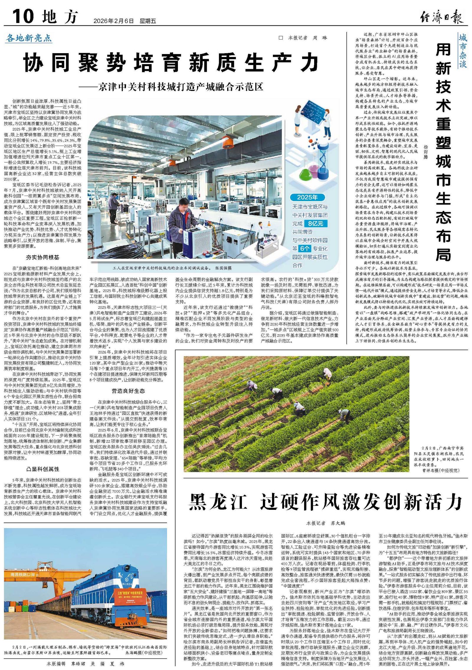 宝坻区委书记毛劲松告诉记者,2025年7月,京津中关村科技城被纳入天开高教科创园“一核两翼多点”空间发展布局,成为京津冀区域首个既有中关村发展集团重资产投入,又有天开园创新基因注入的载体平台。围绕建好用好京津中关村科技城这个全区重要工程,宝坻区正抢抓新一轮科技革命和产业变革深入发展机遇,加快推动产业优势、科技优势、人才优势转化为现实生产力;以推进京津冀协同发展为战略牵引,以更开放的思维、体制、平台,集聚更多资源要素。