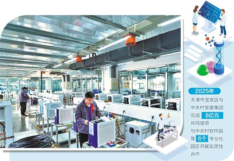 2025年,京津中关村科技城工业总产值、限上批零销售额、固定资产投资、税收同比分别增长14%、79.8%、35.6%、24.3%,带动宝坻全区发展迈上新台阶——2025年宝坻区地区生产总值增长5.1%,规上工业增加值增速位列天津市重点工业十区第一,一般公共预算收入增长19.7%,主要经济指标增速位居天津市前列。目前,该科技城国高新企业达32家,经营主体总数突破2000家。