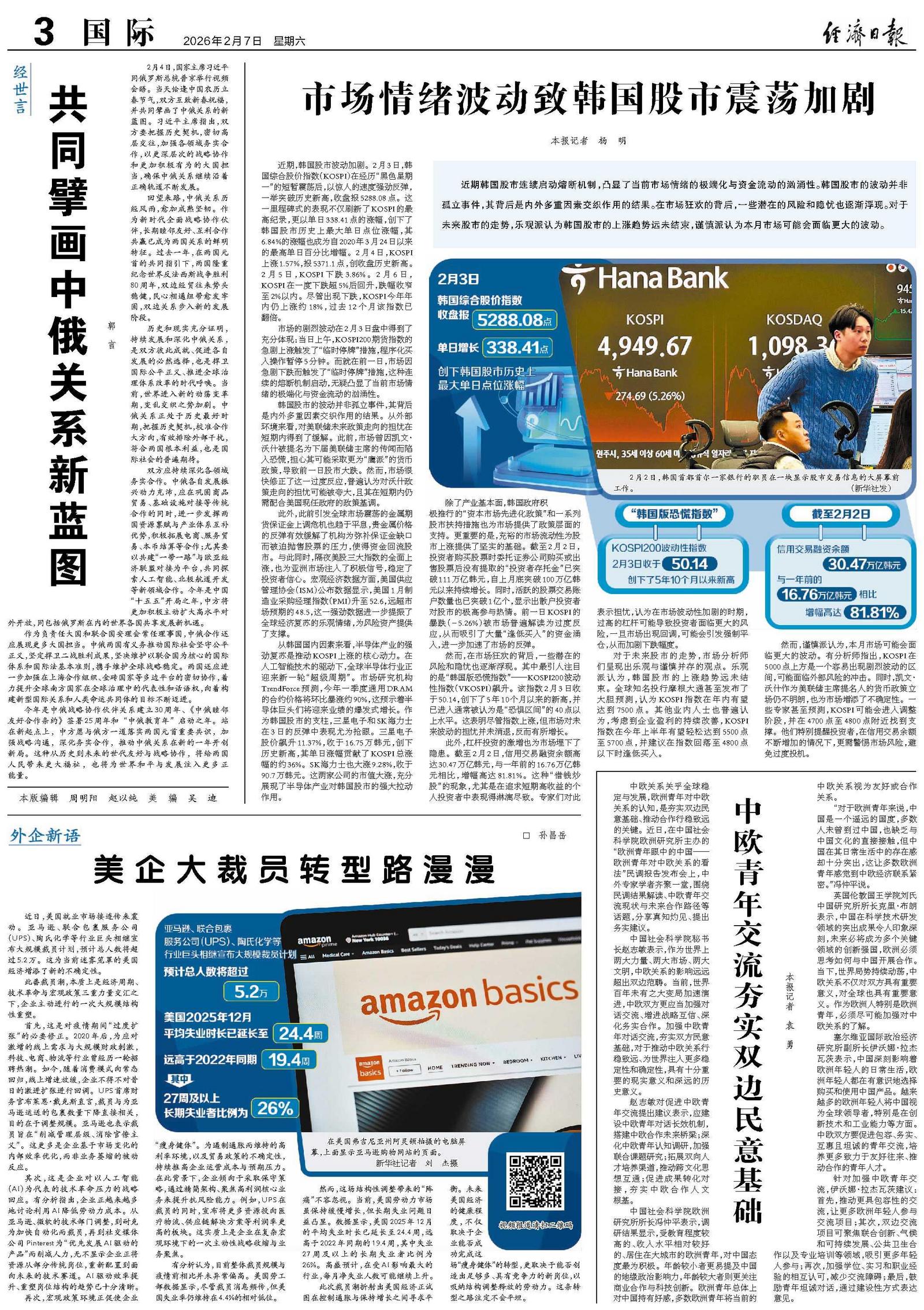 近期,韩国股市波动加剧。2月3日,韩国综合股价指数(KOSPI)在经历“黑色星期一”的短暂震荡后,以惊人的速度强劲反弹,一举突破历史新高,收盘报5288.08点。这一里程碑式的表现不仅刷新了KOSPI的最高纪录,更以单日338.41点的涨幅,创下了韩国股市历史上最大单日点位涨幅,其6.84%的涨幅也成为自2020年3月24日以来的最高单日百分比增幅。2月4日,KOSPI上涨1.57%,报5371.1点,创收盘历史新高。2月5日,KOSPI下跌3.86%。2月6日,KOSPI在一度下跌超5%后回升,跌幅收窄至2%以内。尽管出现下跌,KOSPI今年年内仍上涨约18%,过去12个月该指数已翻倍。