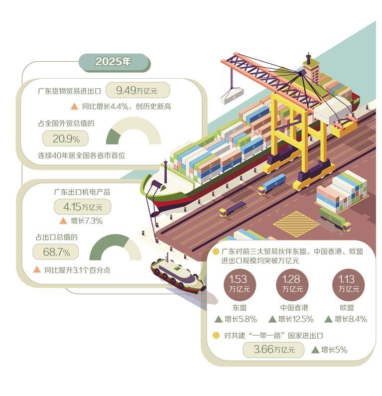 2025年,广东货物贸易进出口9.49万亿元,同比增长4.4%,创历史新高,占全国外贸总值的20.9%,连续40年居全国各省市首位,对全国外贸增长的贡献率达24.1%。广东外贸为何能连续40年霸榜,本报记者进行了深入采访。