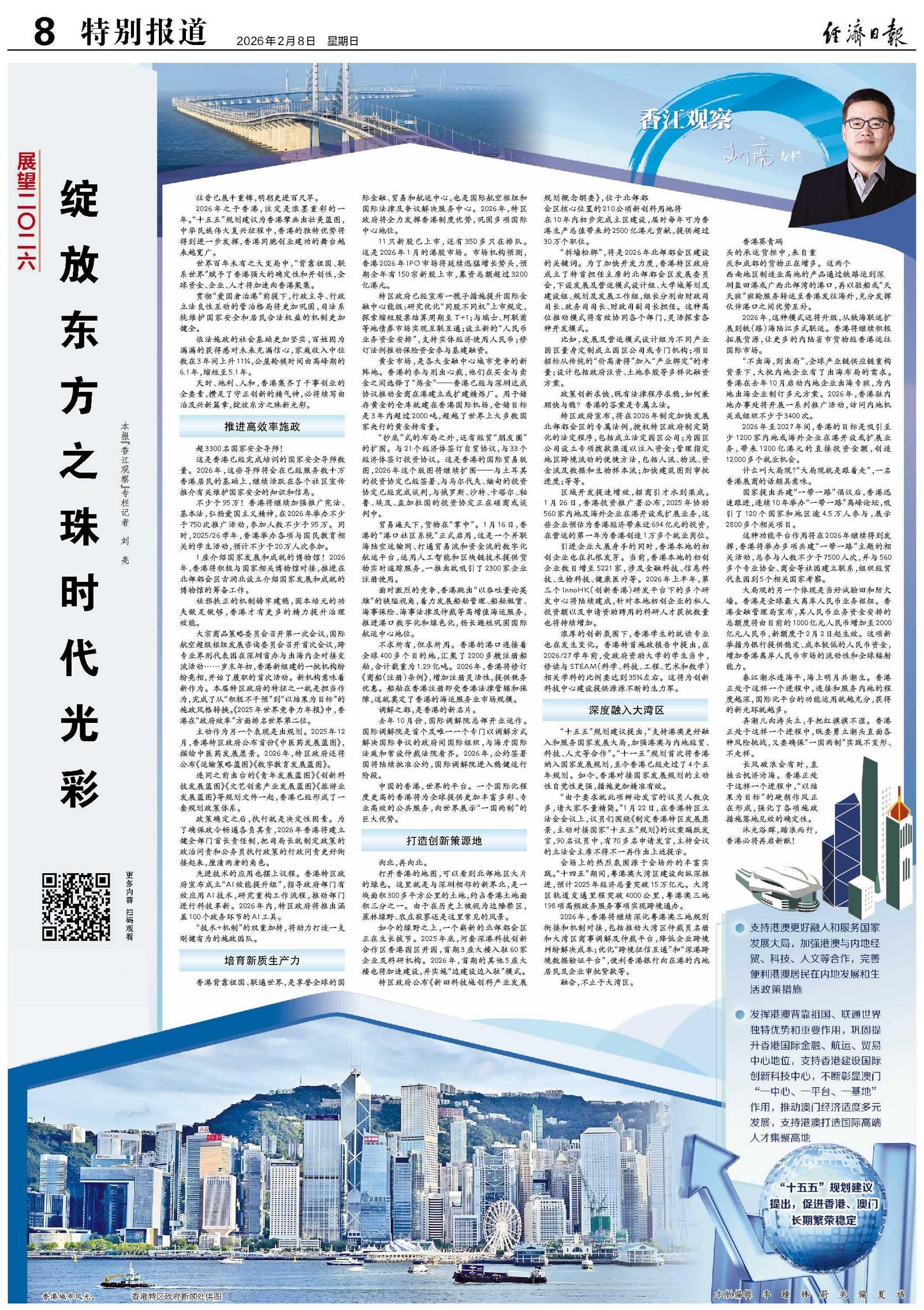 2026年之于香港,注定是浓墨重彩的一年。“十五五”规划建议为香港擘画出壮美蓝图,中华民族伟大复兴征程中,香港的独特优势将得到进一步发挥,香港同胞创业建功的舞台越来越宽广。