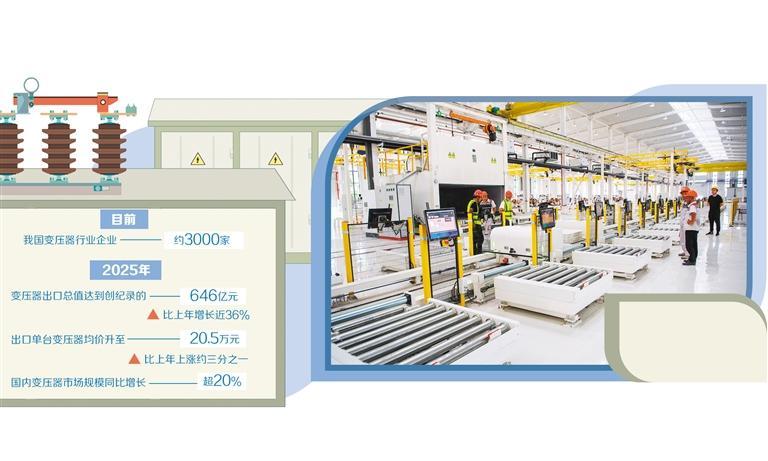 被称为“电力心脏”的变压器,正成为海外市场的紧俏产品。据海关总署数据,2025年我国变压器出口总值达到创纪录的646亿元,比上年增长近36%;出口单台变压器均价升至20.5万元,比上年上涨约三分之一。同时,作为全球重要的变压器生产基地,国内多家头部企业订单出现大幅增长。市场对变压器的需求为何如此巨大?订单大增的同时,企业产能是否跟得上?