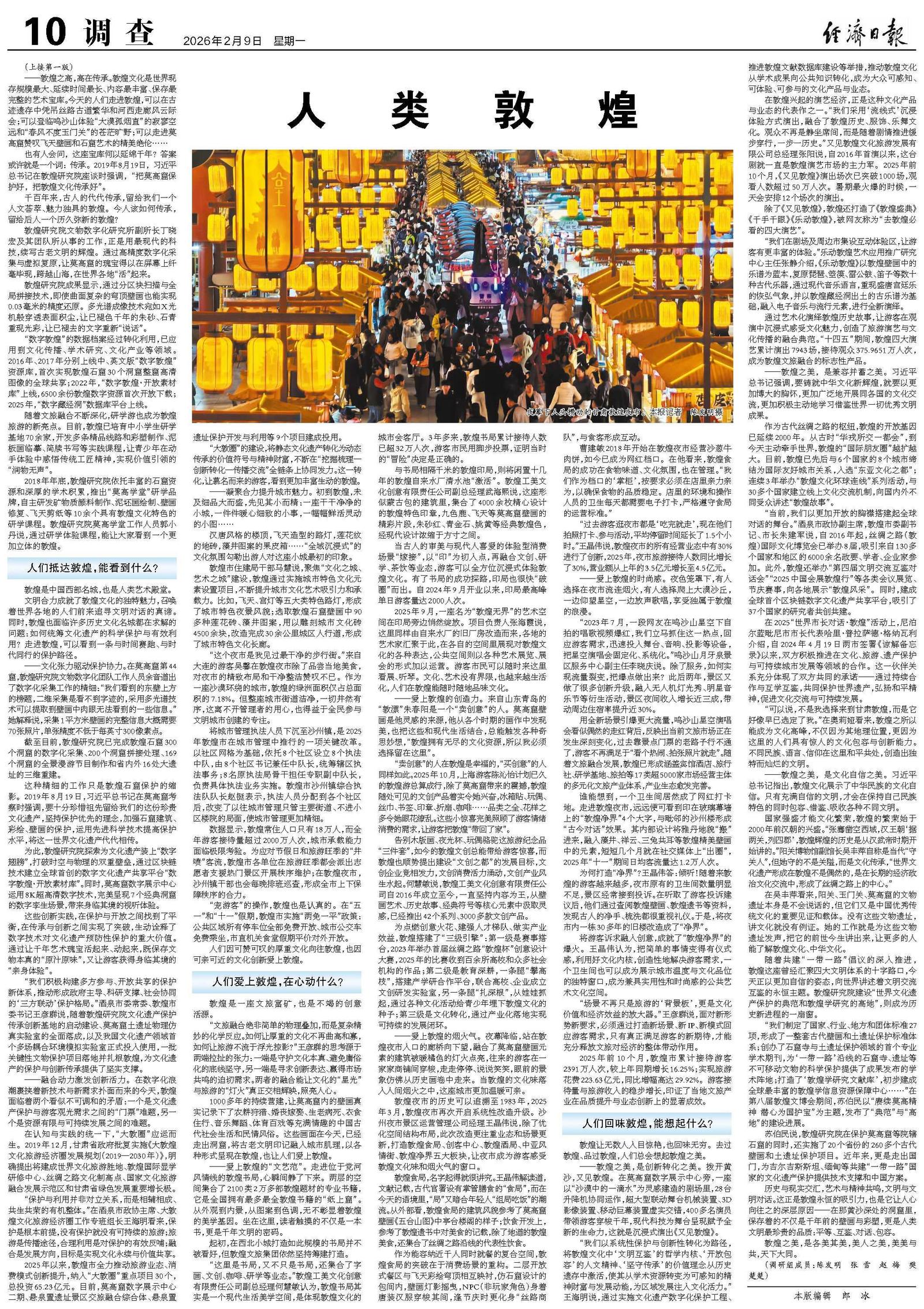 “我们以系统性保护与创新性转化为路径,将敦煌文化中‘文明互鉴’的哲学内核、‘开放包容’的人文精神、‘坚守传承’的价值理念从历史遗存中激活,使其从学术资源转变为可感知的精神财富与发展动能,为区域发展注入文化活力。”王海明说,通过实施文化遗产数字化保护工程、推进敦煌文献数据库建设等举措,推动敦煌文化从学术成果向公共知识转化,成为大众可感知、可体验、可参与的文化产品与业态。