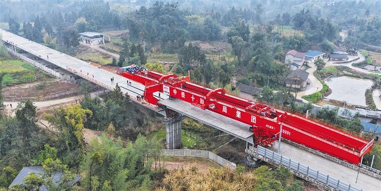 2月9日,随着最后一榀箱梁平稳落位,成渝中线高铁重庆大足段箱梁架设任务收官,为后续无砟轨道铺设、铺轨施工创造条件。新华社记者 陈 诚摄