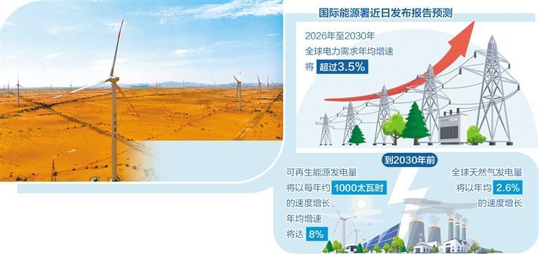 国际能源署近日发布行业报告预测,到2030年,全球电力需求将保持强劲增长。2026年至2030年,全球电力需求年均增速将超过3.5%,主要驱动力来自工业、电动汽车、空调及数据中心用电量的增长,其中,可再生能源与核能在全球电力结构中的占比将提升至50%。