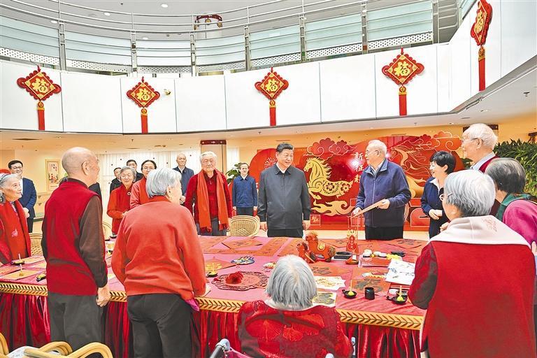 在银龄老年公寓,习近平详细了解老年人健康检查、康复训练、日常起居照料等情况。大厅里,一些老人正在写春联和福字,习近平来到他们中间,欣赏他们的创作,勉励他们老骥伏枥、老有所为,祝他们健康长寿、春节快乐。