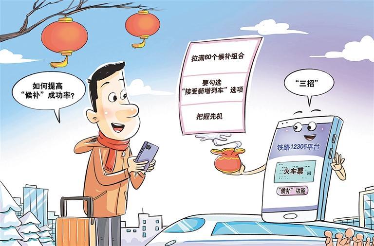 春节临近,12306平台的“候补”功能再次火爆,不少网友借此功能成功“捡漏”。候补票源分两类,一种是常规的退票、改签释放席位,一种是铁路部门根据候补数据新增的运力。那么,提交候补时,如何才能成功“兑现”?旅客可以拉满候补组合,每个用户能同时提交6个候补订单,每个订单可选3个乘车日期,最多能凑60个“日期+车次”组合,还能勾选多个席别。提交订单时,一定要勾选“接受新增列车”,当出现加开列车时,系统会自动兑现。把握先机,排队位置越靠前,成功率越高,提前绑定好支付方式,核对好乘车人信息,别因支付超时、信息填错而错失机会。(时 锋)