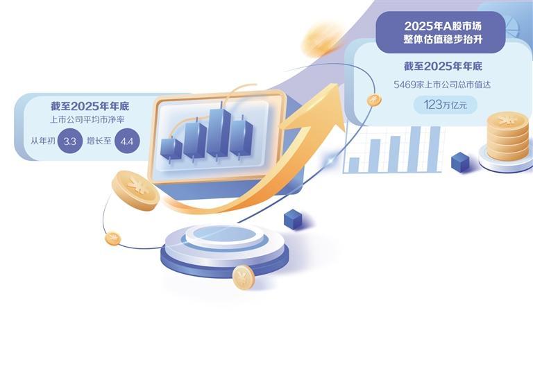 “投资有回报—资金积极入市—融资效率提升—上市公司质量提高”这一正向循环逐步形成,上市公司市值增长是客观映射。数据显示,2025年A股市场整体估值稳步抬升,截至2025年年底,5469家上市公司总市值达123万亿元,上市公司平均市净率从年初3.3增长至4.4。此外,公募基金中A股配置比重增长2.4个百分点,反映出投资者对中国经济高质量转型和企业科技创新发展的认可。