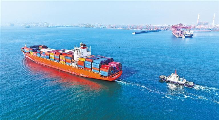 2月4日,山东港口青岛港,装载外贸集装箱的货轮驶入港口。青岛港装载外贸集装箱的巨轮近期进出不断,外贸集装箱码头一派繁忙景象。俞方平摄(中经视觉)