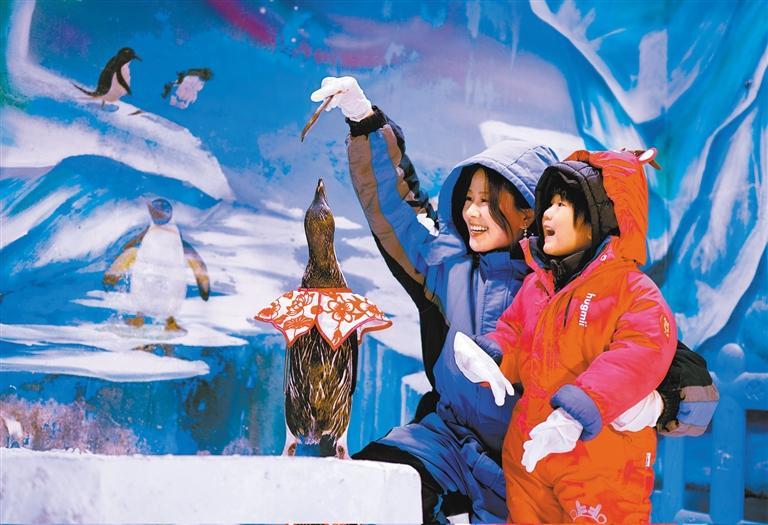 1月28日,小朋友在上海海昌海洋公园与穿着传统服饰的企鹅互动。 朱 骏摄 (中经视觉)