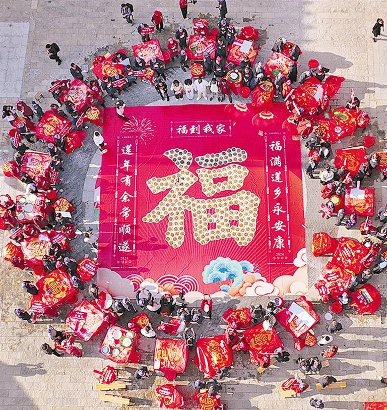 2月14日,江西省抚州市广昌县甘竹镇旴源首镇景区,非遗捶鱼匠人们将制作的捶鱼丝拼成了一幅巨型“福”字图案。曾恒贵摄(中经视觉)