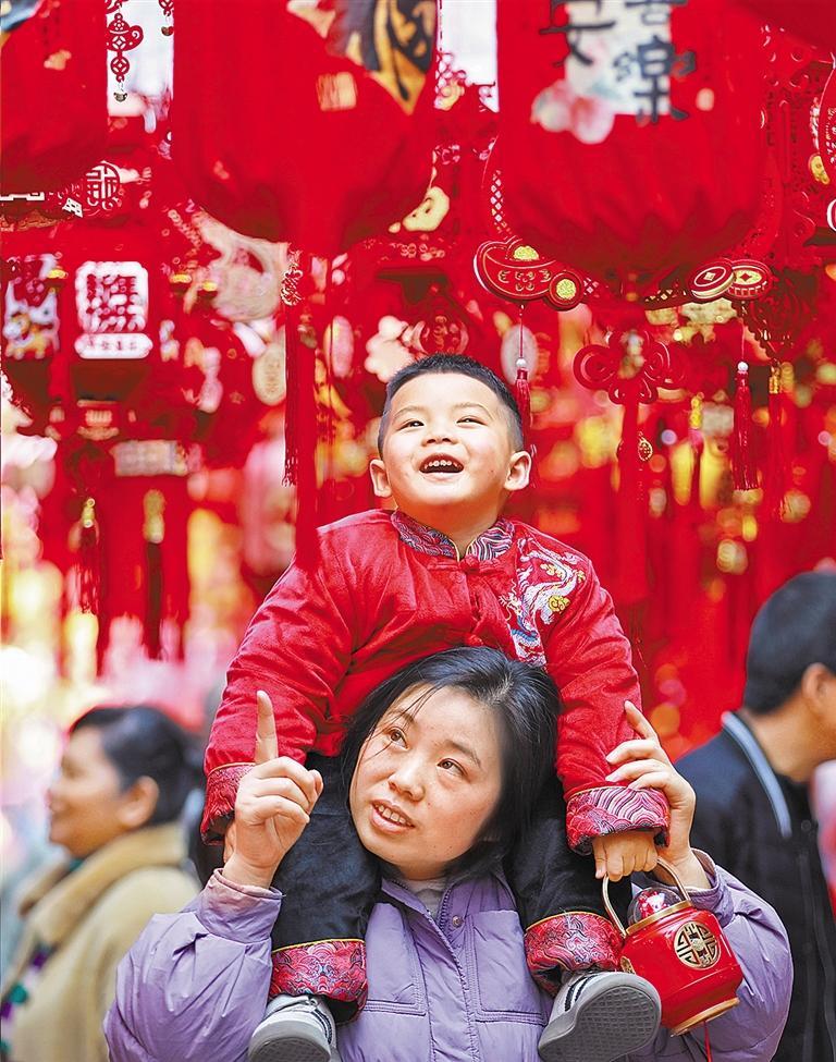 2月14日,游客在贵州省都匀市文峰广场年画市场游玩。 肖 伟摄(中经视觉)