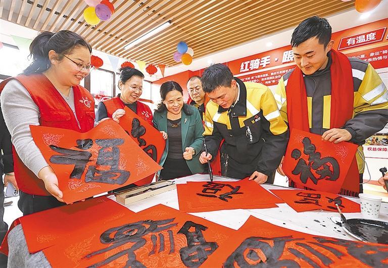 2月13日,山东省青岛市即墨古城,新就业群体人员在暖“新”驿站写福字,迎佳节。梁孝鹏摄(中经视觉)