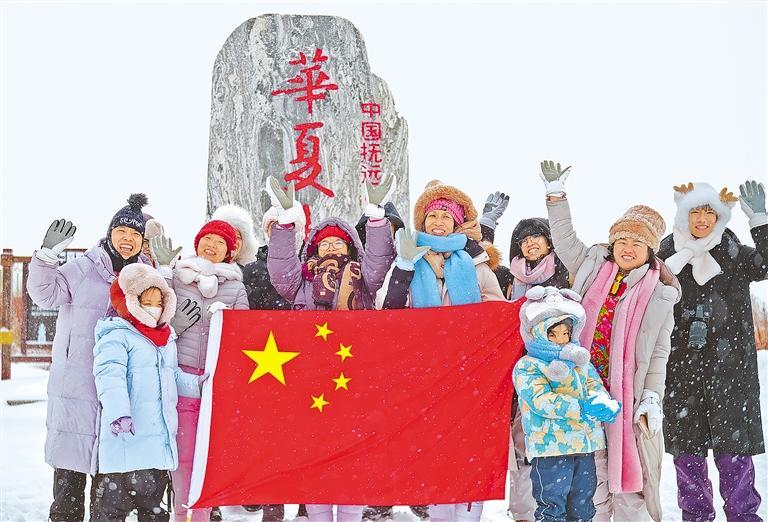 2月15日,游客在位于黑龙江省抚远市的黑瞎子岛景区“华夏东极”地标处与国旗合影。本报记者 朱双健摄