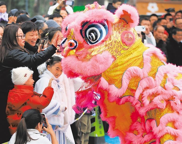 ▶2月17日,浙江省温岭市锦屏公园,市民游客与舞狮互动。