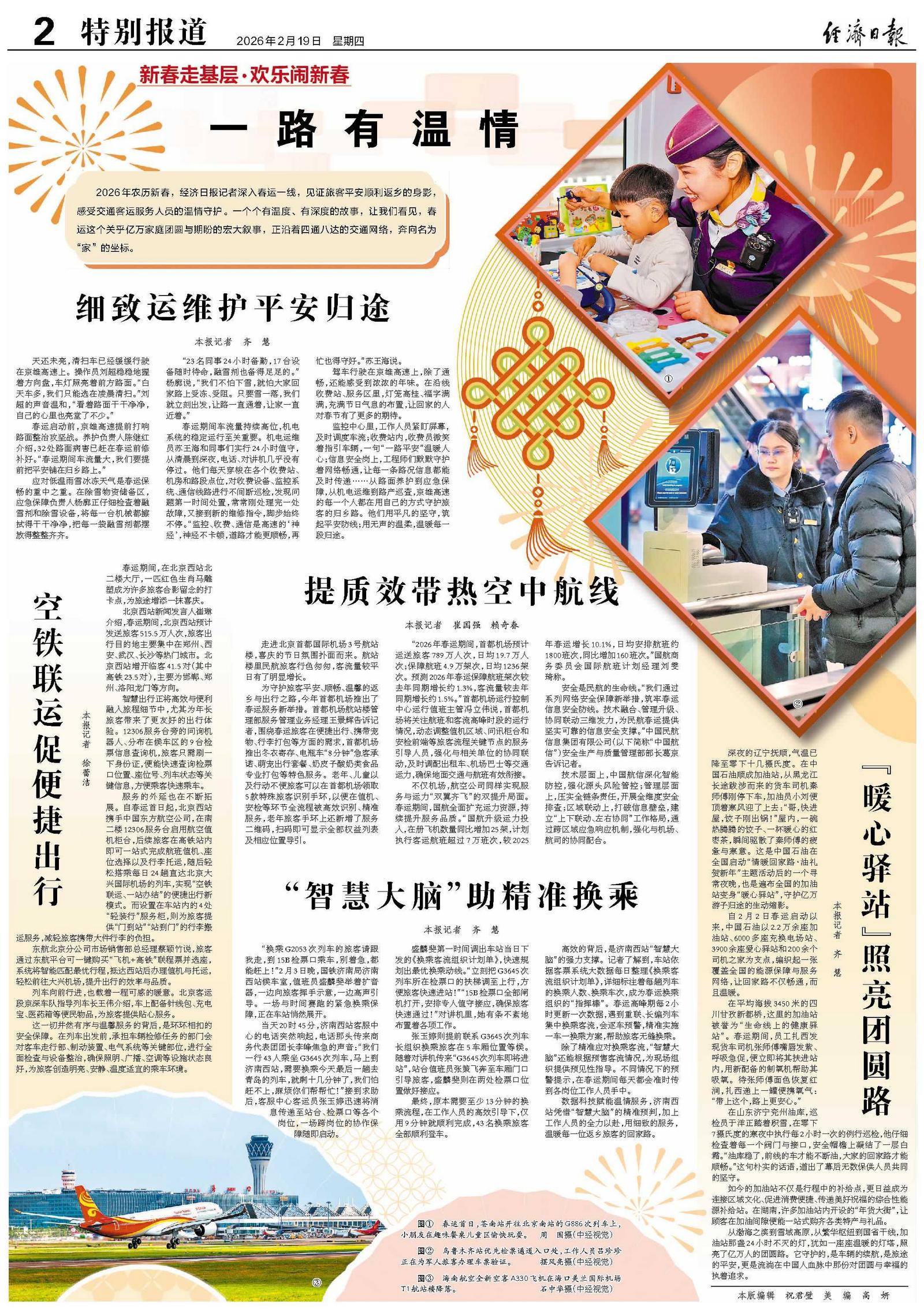 不仅机场,航空公司同样实现服务与运力“双翼齐飞”的双提升局面。春运期间,国航全面扩充运力资源,持续提升服务品质。“国航升级运力投入,在册飞机数量同比增加25架,计划执行客运航班超过7万班次,较2025年春运增长10.1%,日均安排航班约1800班次,同比增加160班次。”国航商务委员会国际航班计划经理刘雯琦称。