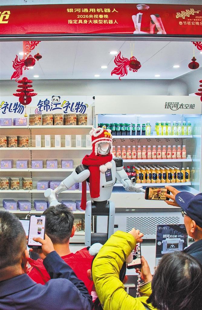 2月18日,四川省成都市锦江区春熙路机器人零售店前,消费者与智能机器人互动购物,感受科技带来的新春乐趣。