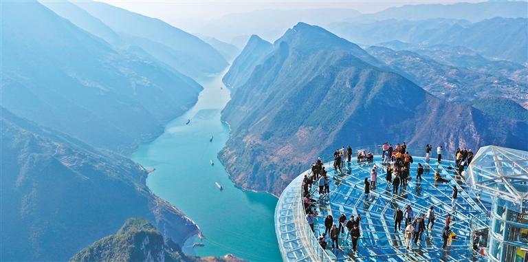 2月19日,湖北省恩施土家族苗族自治州巴东县巫峡口景区,游客在玻璃栈道上欣赏巫峡与长江大拐弯的壮美风光,在天然山水画卷中欢度春节假期。
