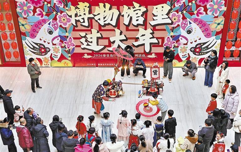 2月19日,游客在河北省秦皇岛博物馆参加“博物馆里过大年”主题系列活动。
