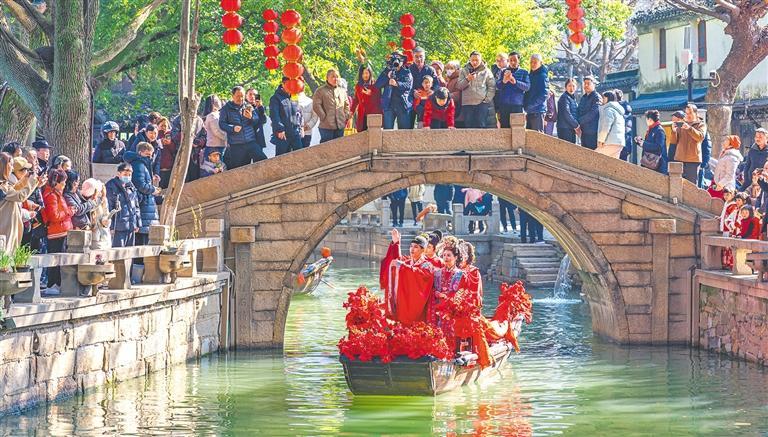 2月17日,江苏省苏州市吴江区,游客在同里古镇观看水上婚礼巡游。