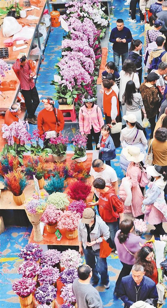 2月19日,云南省昆明市呈贡区斗南花市,鲜花交易火爆,人们赏花购花,用鲜花装点假日生活。