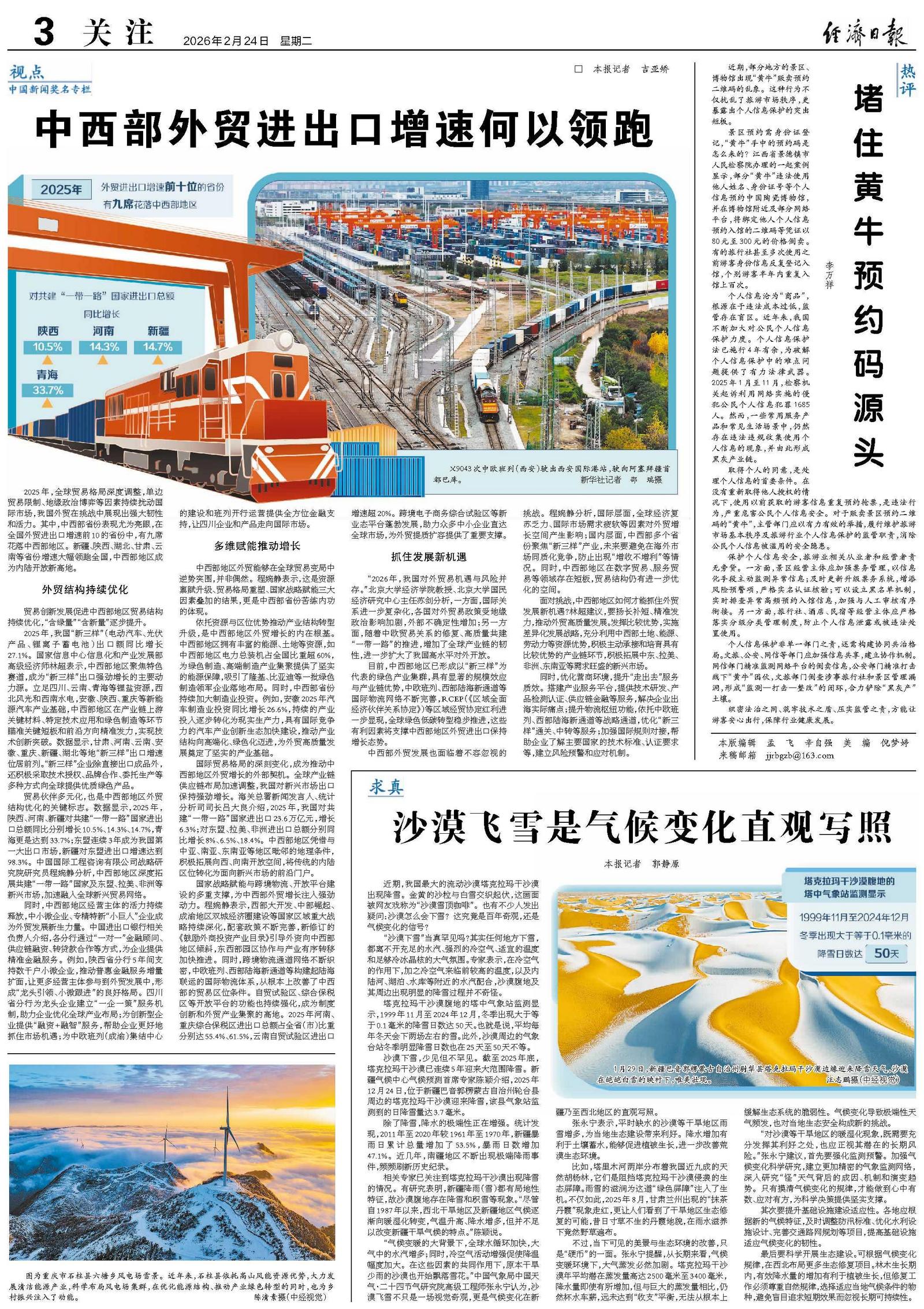 “气候变暖的大背景下,全球水循环加快,大气中的水汽增多;同时,冷空气活动增强促使降温幅度加大。在这些因素的共同作用下,原本干旱少雨的沙漠也开始飘落雪花。”中国气象局中国天气·二十四节气研究院高级工程师张永宁认为,沙漠飞雪不只是一场视觉奇观,更是气候变化在新疆乃至西北地区的直观写照。