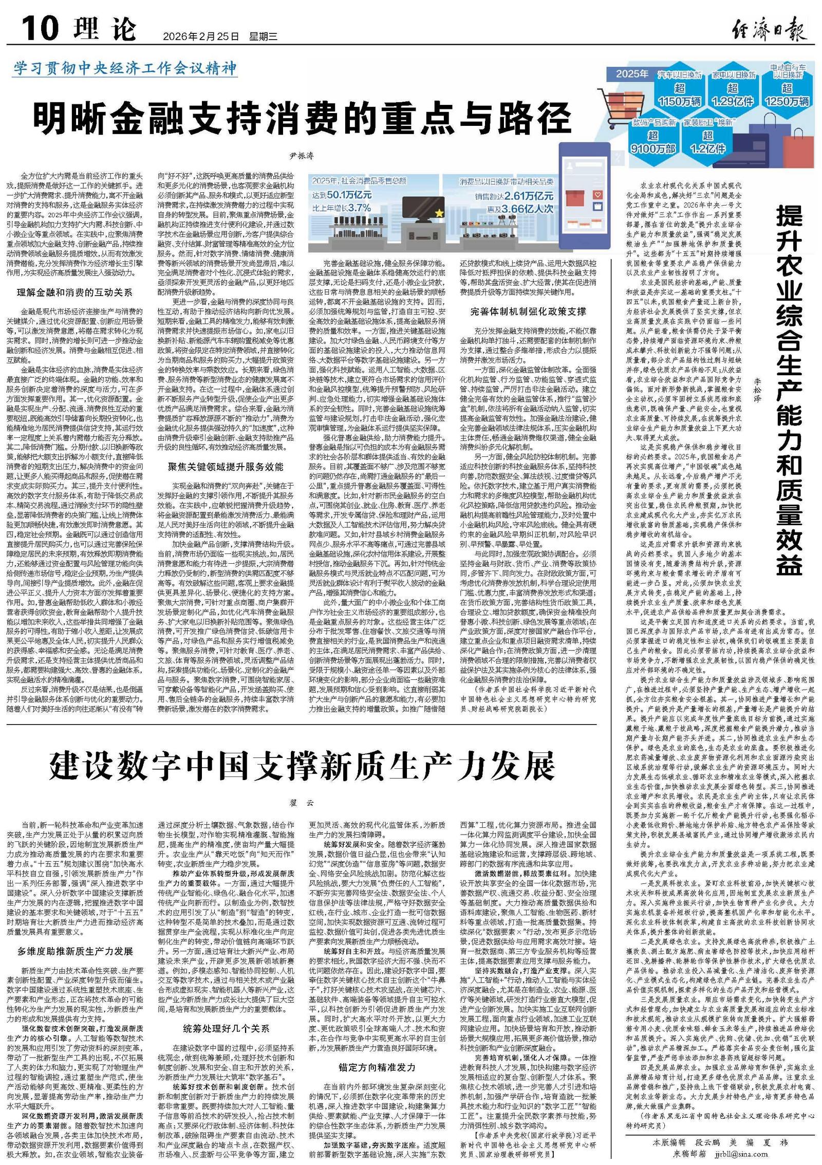 全方位扩大内需是当前经济工作的重头戏,提振消费是做好这一工作的关键抓手。进一步扩大消费需求、提升消费能力,离不开金融对消费的支持和服务,这是金融服务实体经济的重要内容。2025年中央经济工作会议强调,引导金融机构加力支持扩大内需、科技创新、中小微企业等重点领域。在实践中,应聚焦消费重点领域加大金融支持、创新金融产品,持续推动消费领域金融服务提质增效,从而有效激发消费潜能,充分发挥消费作为经济增长主引擎作用,为实现经济高质量发展注入强劲动力。