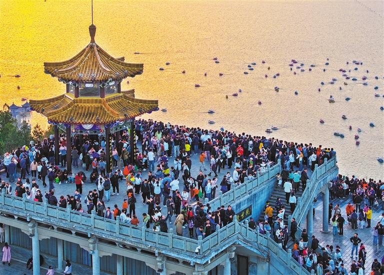 ▲2月20日,江苏省徐州市云龙山观景台,游客共赏落日熔金。