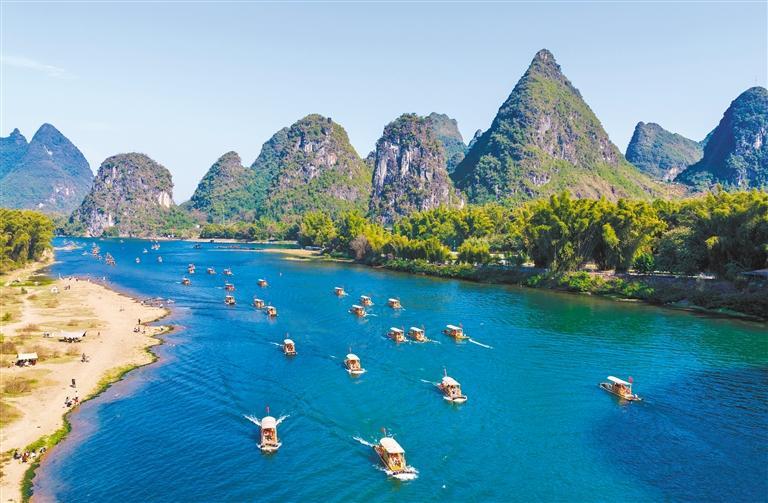 ▼2月20日,广西桂林市阳朔县漓江,游客乘坐竹筏在绿水青山间穿行。夏立慧摄(中经视觉)