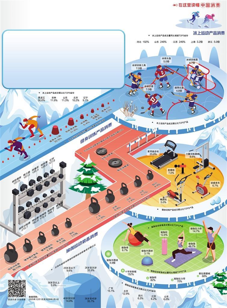 除了参与冰雪运动的人数不断增长,南方消费者的冰雪消费也从“体验式消费”转向“常态化运动”。冰雪运动装备消费增长较快,浙江、上海、江苏等省份的冰上运动产品成交量同比增速位居前列,其中浙江同比增长达5倍、上海达3.2倍。在越来越多的南方城市,滑雪正以一种更日常的方式融入人们生活。