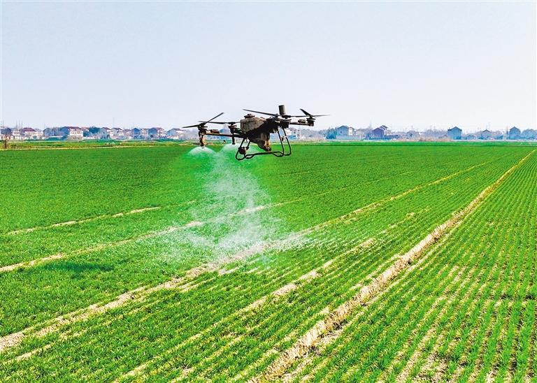 ▼2月18日,江苏省泰州市胡庄镇丁庄村,农业植保无人机进行小麦春季除虫作业。杨玉岗摄(中经视觉)