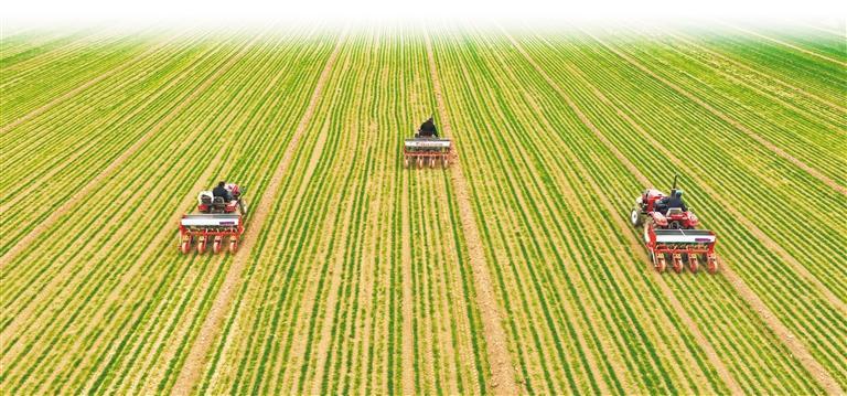 ▼2月25日,山东省聊城市茌平区润土农机专业合作社,农机手驾驶拖拉机进行小麦施肥作业。赵玉国摄(中经视觉)