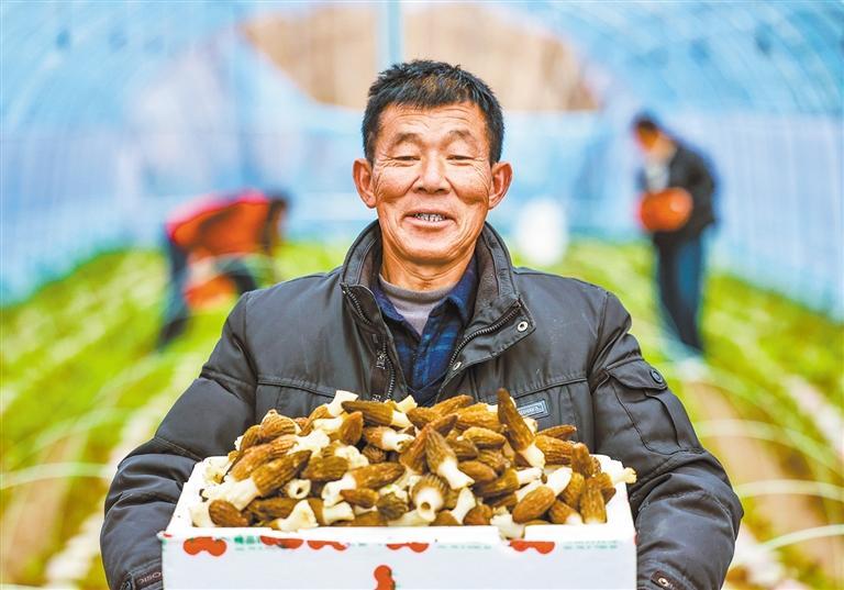 ◀2月25日,安徽省马鞍山市刘山村羊肚菌种植基地,村民在采摘羊肚菌。王文生摄(中经视觉)