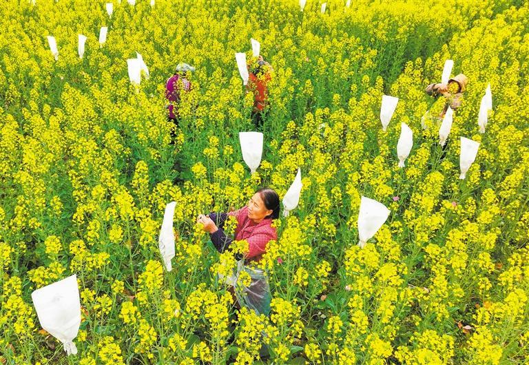▼2月24日,重庆市垫江县沙坪镇毕桥村制种油菜基地,工人在给油菜授粉。龚长浩摄(中经视觉)
