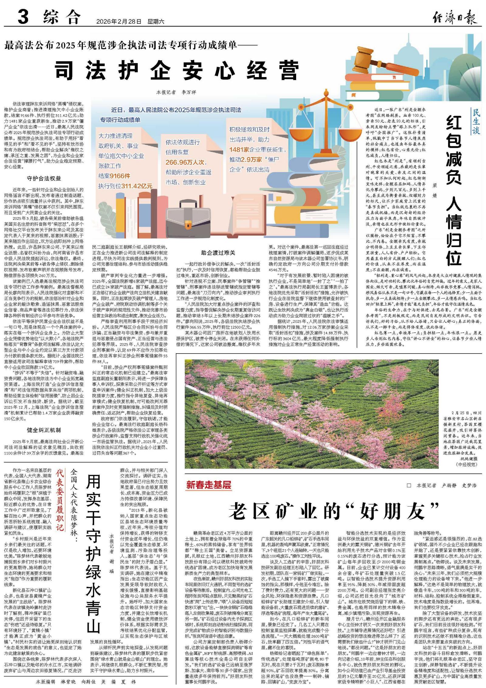 依法审理胖东来诉网络“黑嘴”侵权案,维护企业商誉;推进清理拖欠中小企业账款,结案9166件、执行到位311.42亿元;助力1481家企业重获新生,推动2.9万家“僵尸企业”依法出清……近日,最高人民法院公布2025年规范涉企执法司法专项行动成绩单。规范涉企执法司法,有助于用好“看得见的手”和“看不见的手”,坚持有效市场和有为政府相结合,帮助企业解决“维权之痛、承压之重、发展之困”,为企业和企业家合法经营“撑腰打气”,助力企业稳定预期、安心经营。